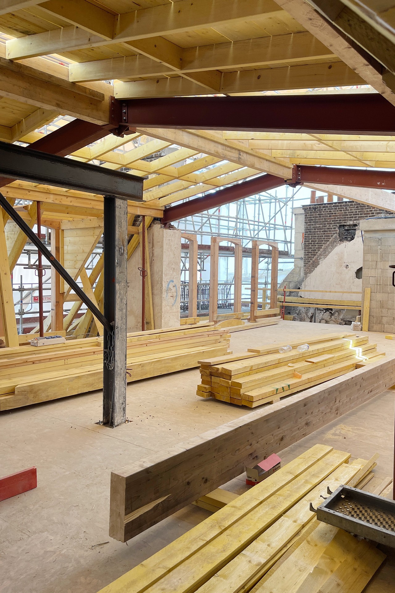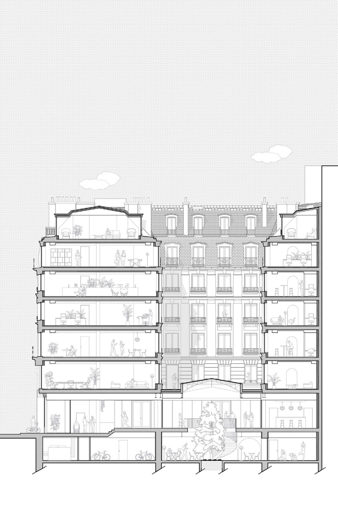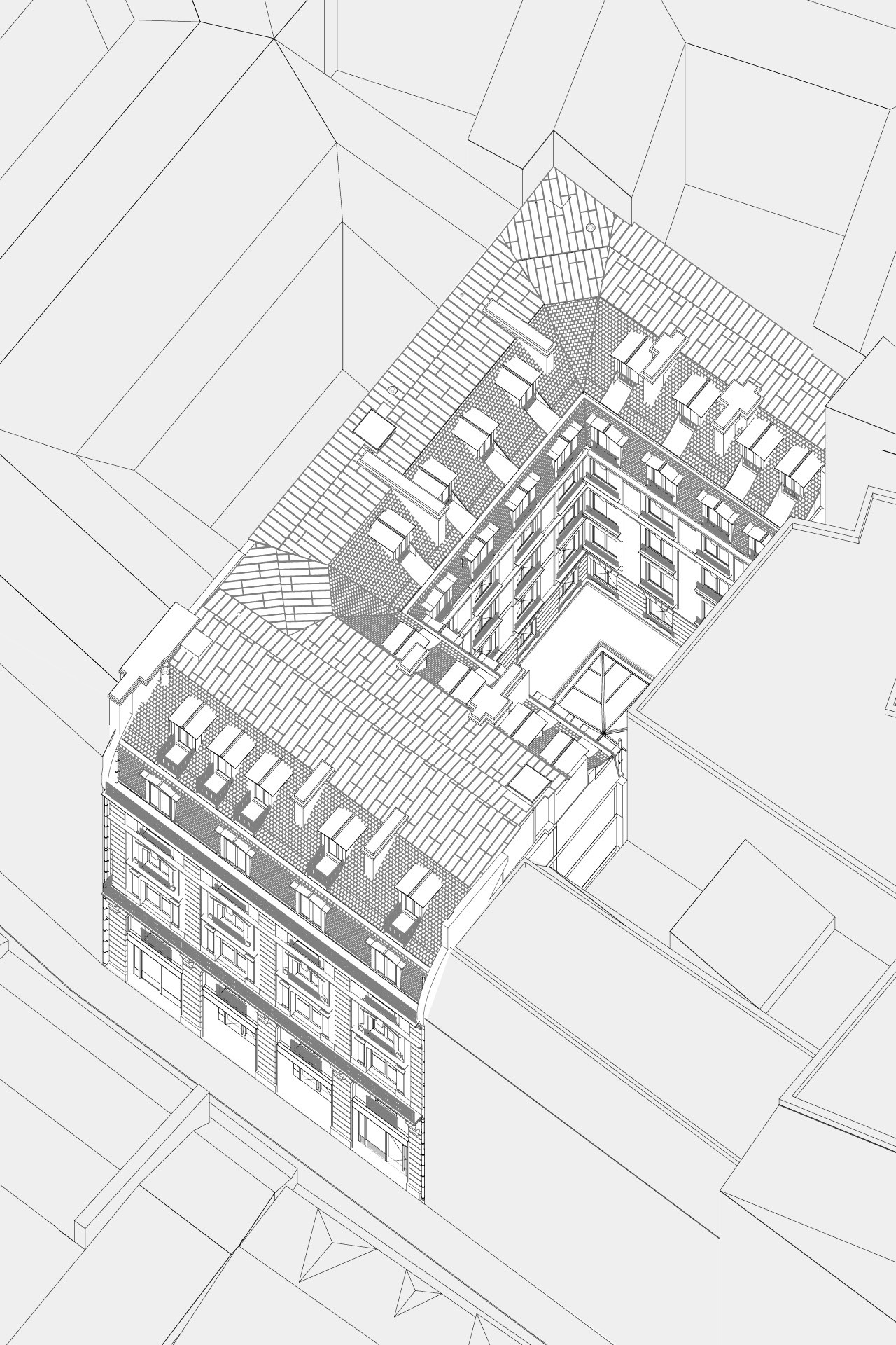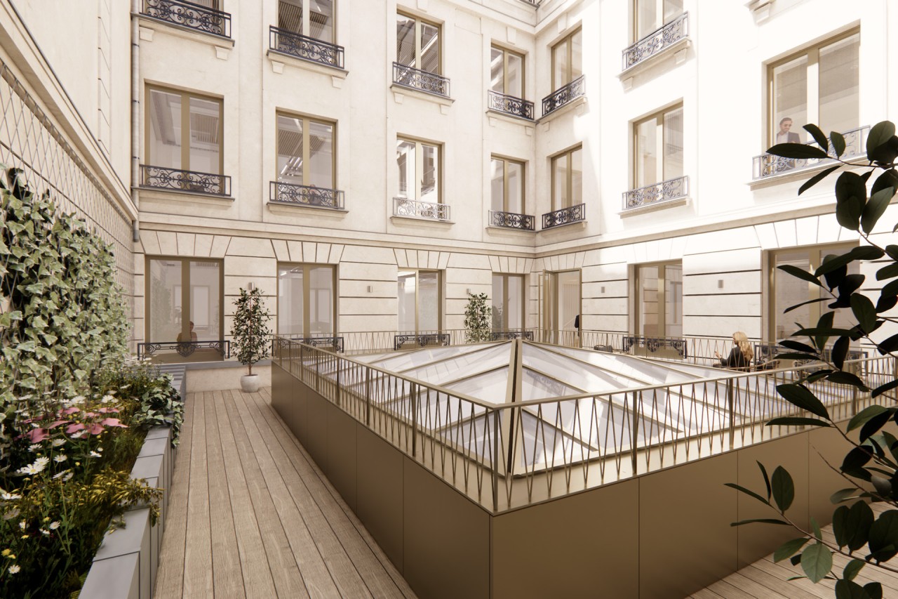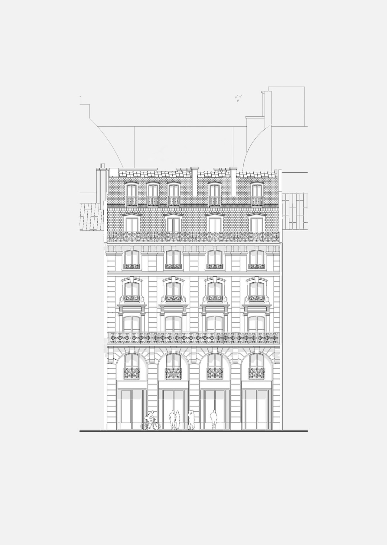 Hommage à la composition historique du bâtiment, les transformations en façade et en toiture participent à améliorer l’insertion du bâtiment dans son contexte urbain. Au premier étage, la verrière créée permet l’apport de lumière naturelle au plus profond du bâtiment et à l’étage de sous-sol jusqu’alors réservé aux locaux techniques. En plein cœur de Paris, ce projet privilégie ainsi la densification des usages en qualifiant les espaces résiduels.