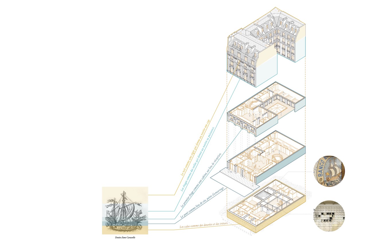 Ancien Hôtel du Tibre de 1904, transformé en Banque Portugaise dans les années 1950, le projet met en valeur les vestiges d’une époque révolue pour écrire le futur d’un lieu innovant qui réinterroge le bureau post-crise sanitaire.