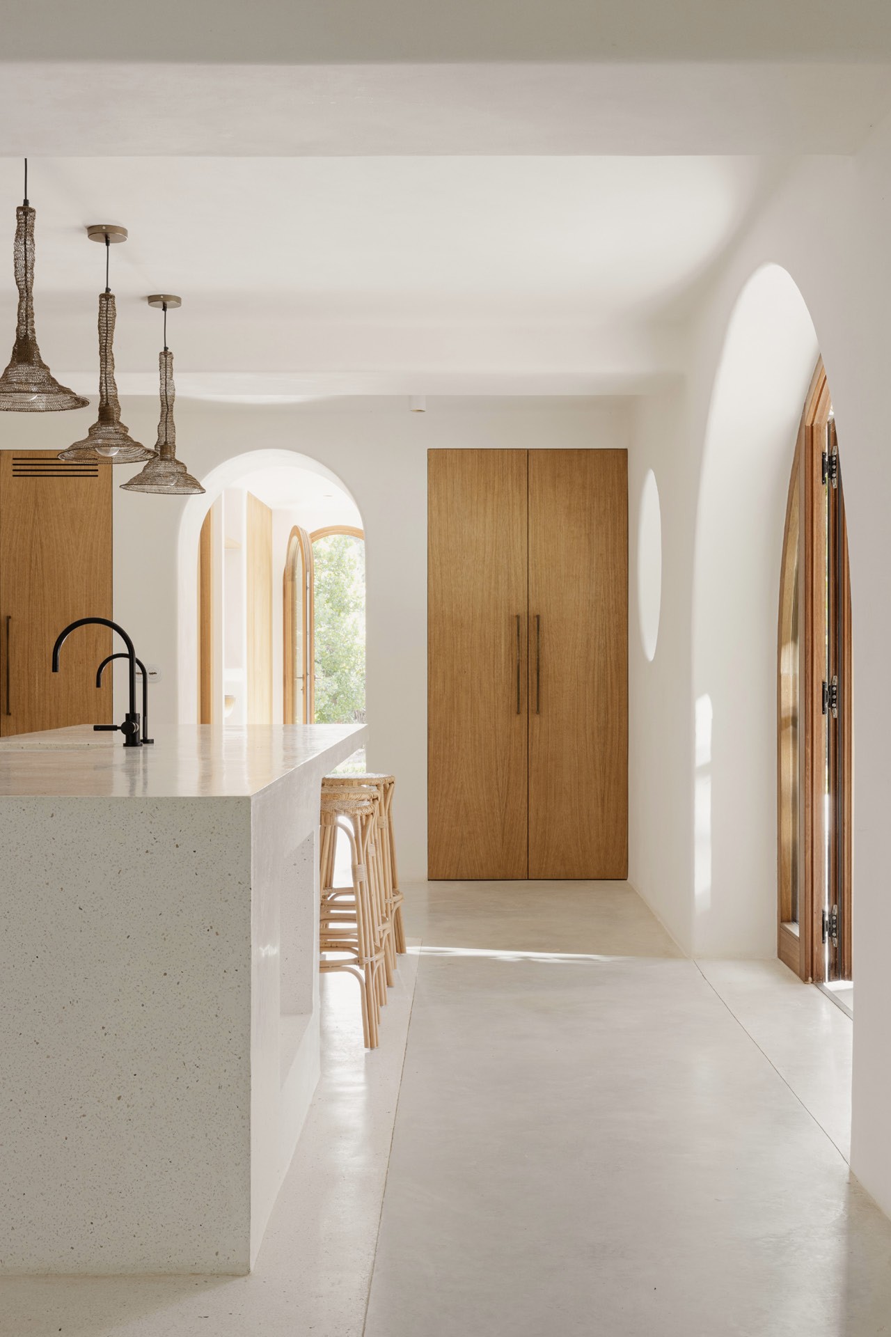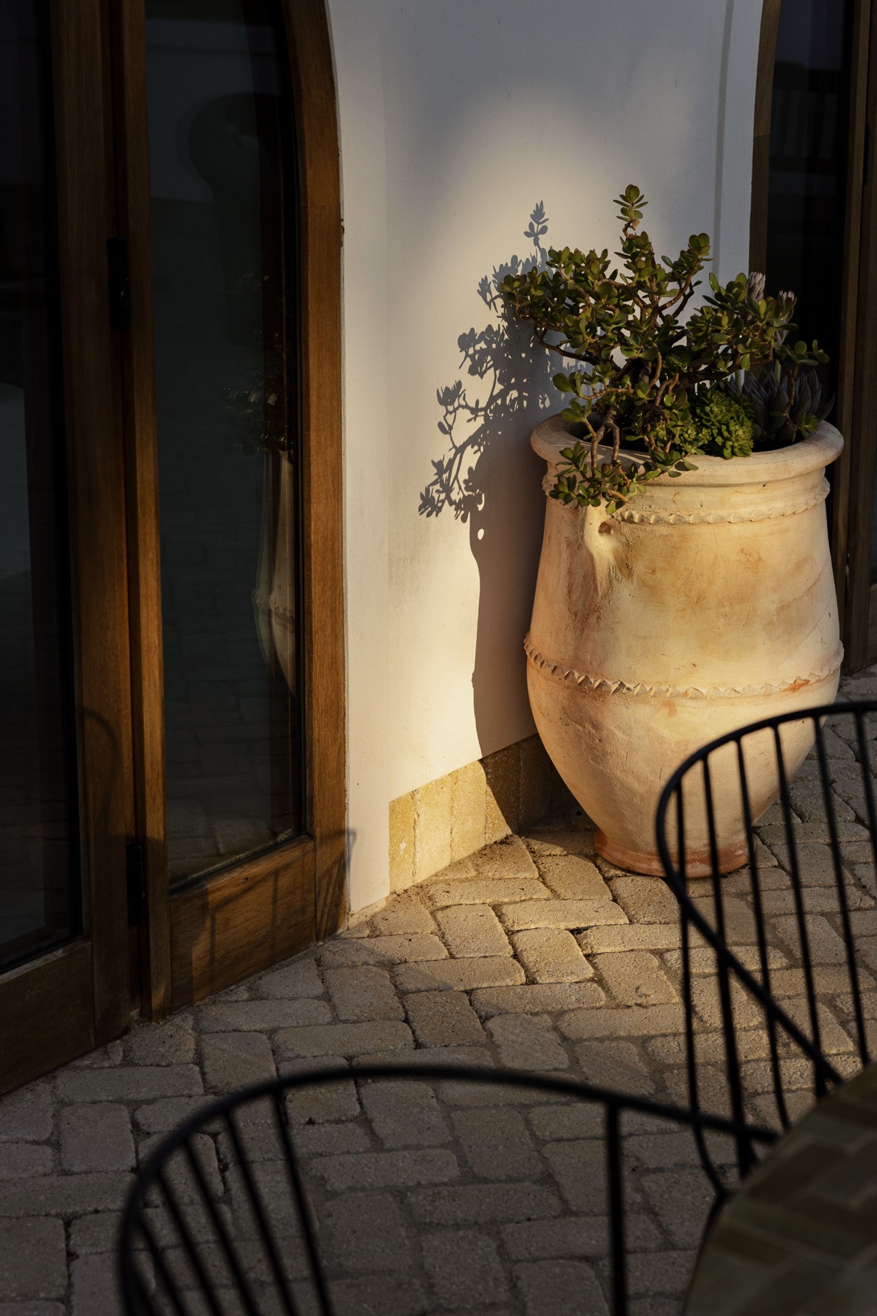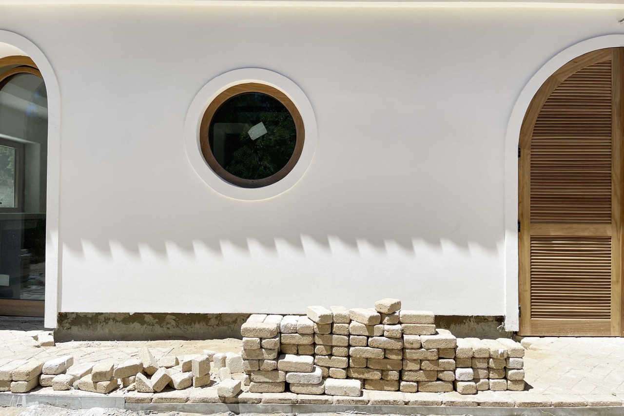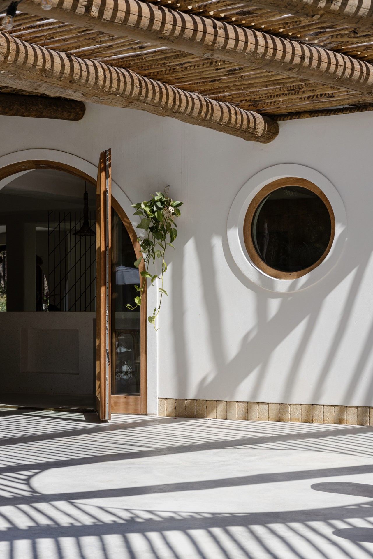 Les conditions climatiques auxquelles le site est exposé ont guidé l’esthétique et le choix de matériaux adaptés au contexte. Entièrement recouverts d’un enduit à la chaux, tant à l’extérieur qu’à l’intérieur, les murs isolés de la maison respirent et régulent naturellement le taux d’hygrométrie. Ils contribuent au bien-être des occupants et à la durabilité du bâtiment, tout en conférant à la maison une atmosphère douce et chaleureuse en captant la lumière naturelle.