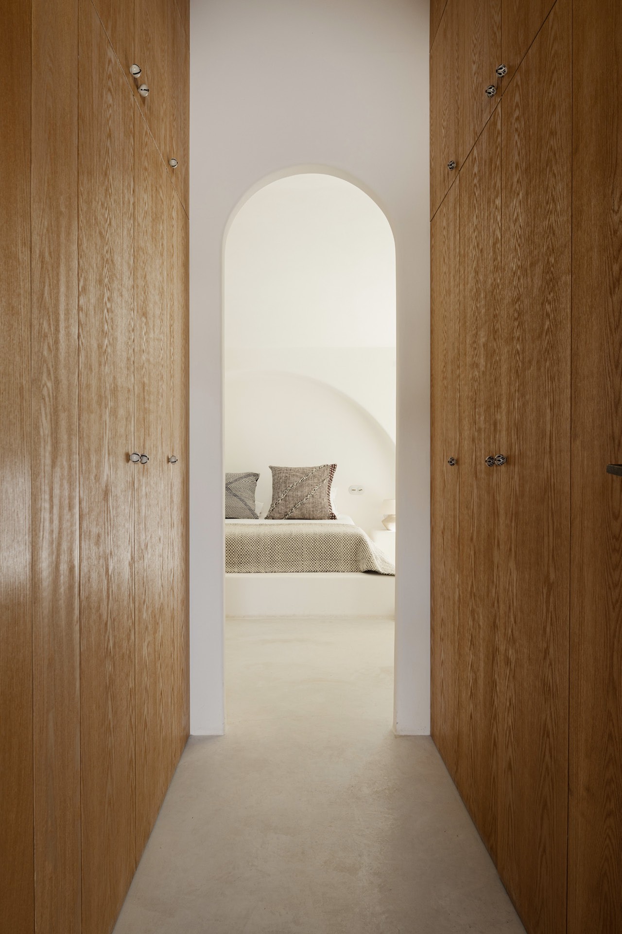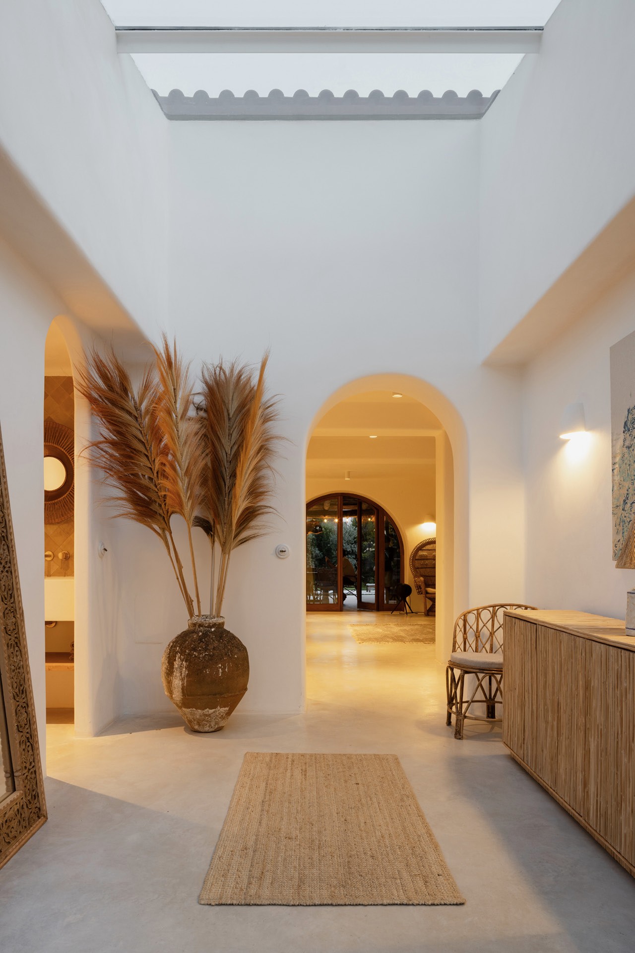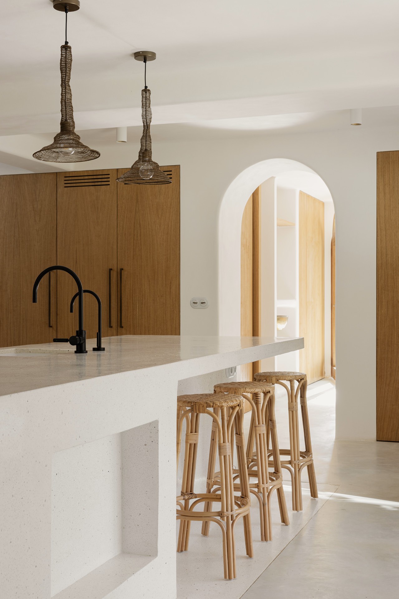 Les conditions climatiques auxquelles le site est exposé ont guidé l’esthétique et le choix de matériaux adaptés au contexte. Entièrement recouverts d’un enduit à la chaux, tant à l’extérieur qu’à l’intérieur, les murs isolés de la maison respirent et régulent naturellement le taux d’hygrométrie. Ils contribuent au bien-être des occupants et à la durabilité du bâtiment, tout en conférant à la maison une atmosphère douce et chaleureuse en captant la lumière naturelle.
