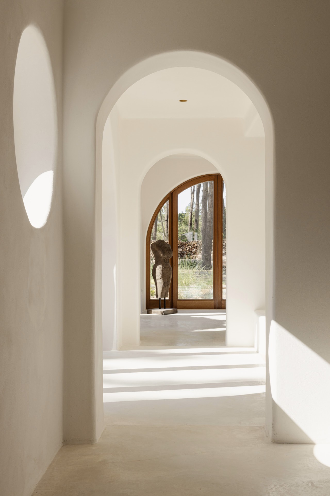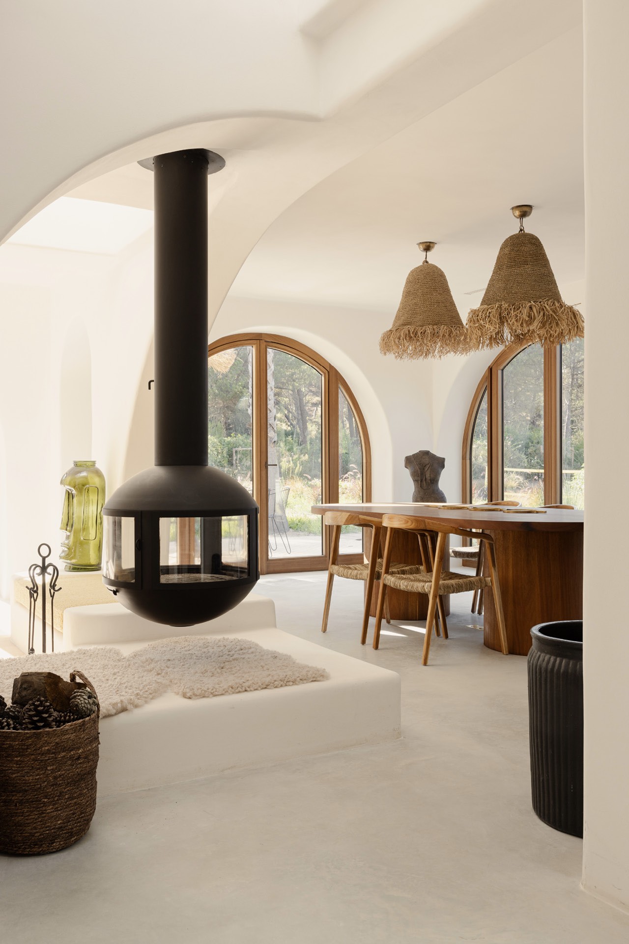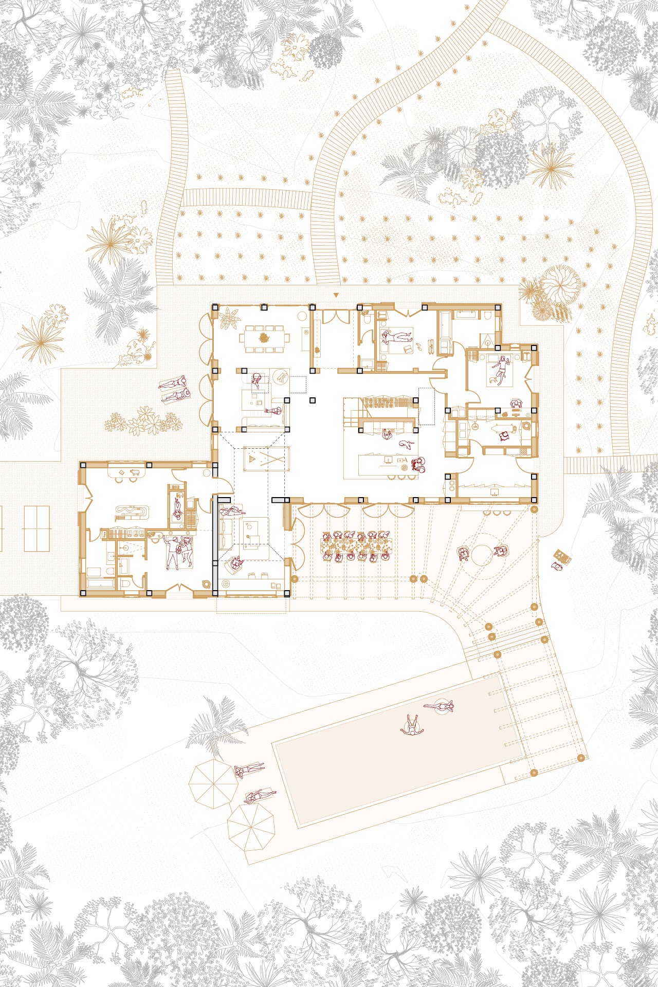 La maison est réorganisée autour d’un grand cœur ouvert, traversant et naturellement ventilé, qui concentre les pièces de vie principales et s’ouvre sur la pinède environnante grâce à de grandes baies cintrées, rappelant celles du jardin d’hiver existant. En périphérie de ce cœur vivant et central, se déploient plusieurs espaces nuit, isolés du bruit.
