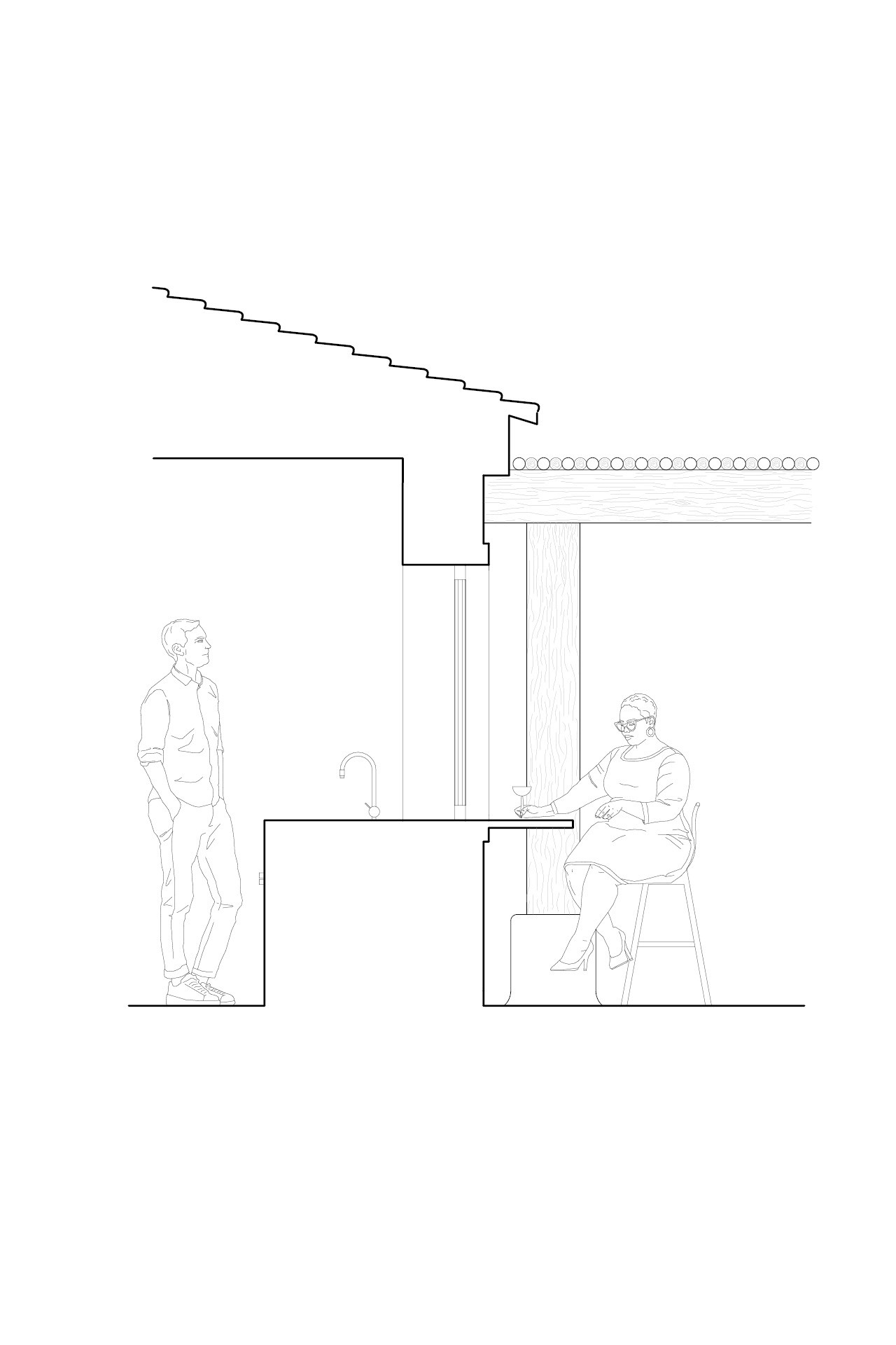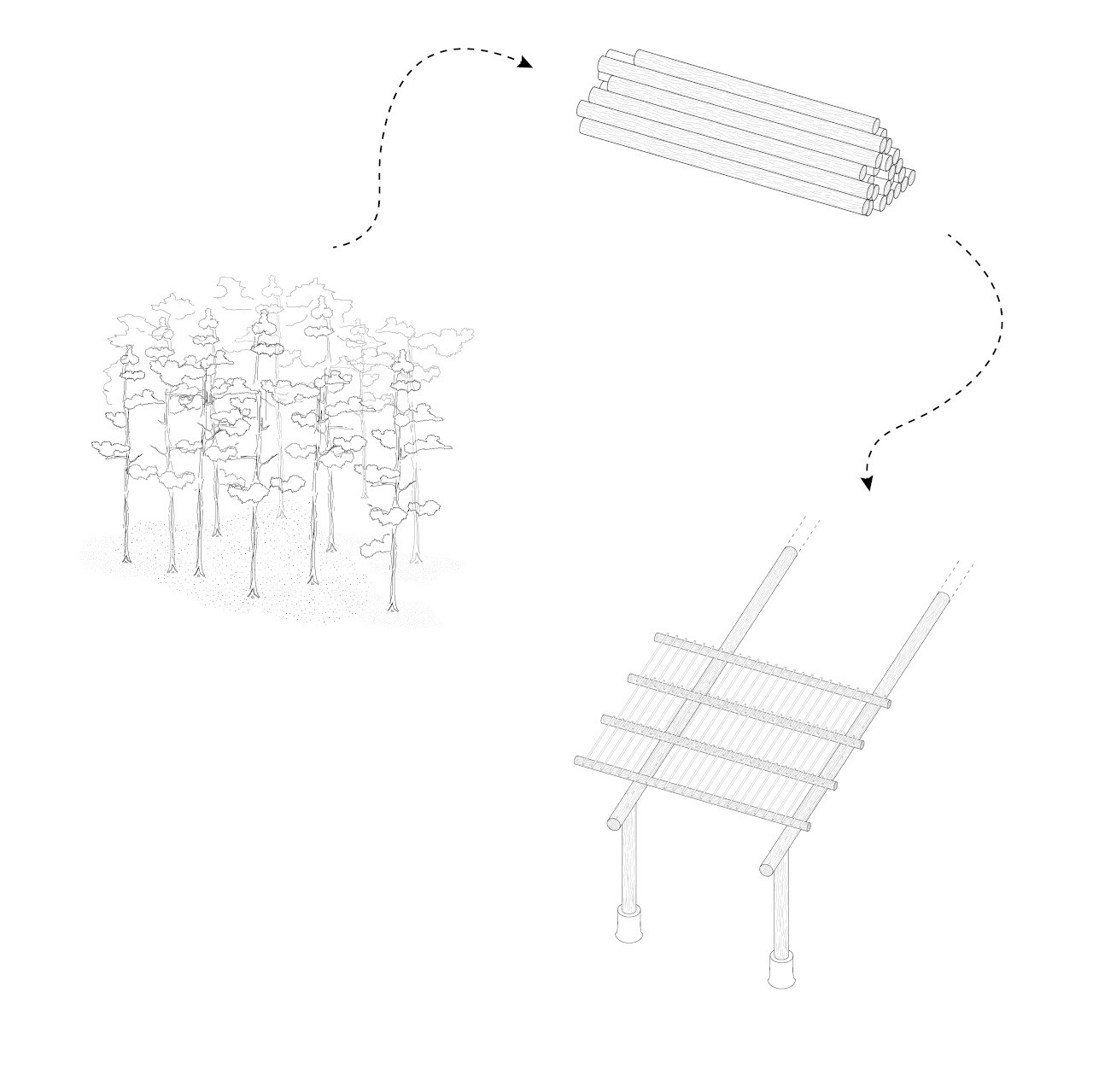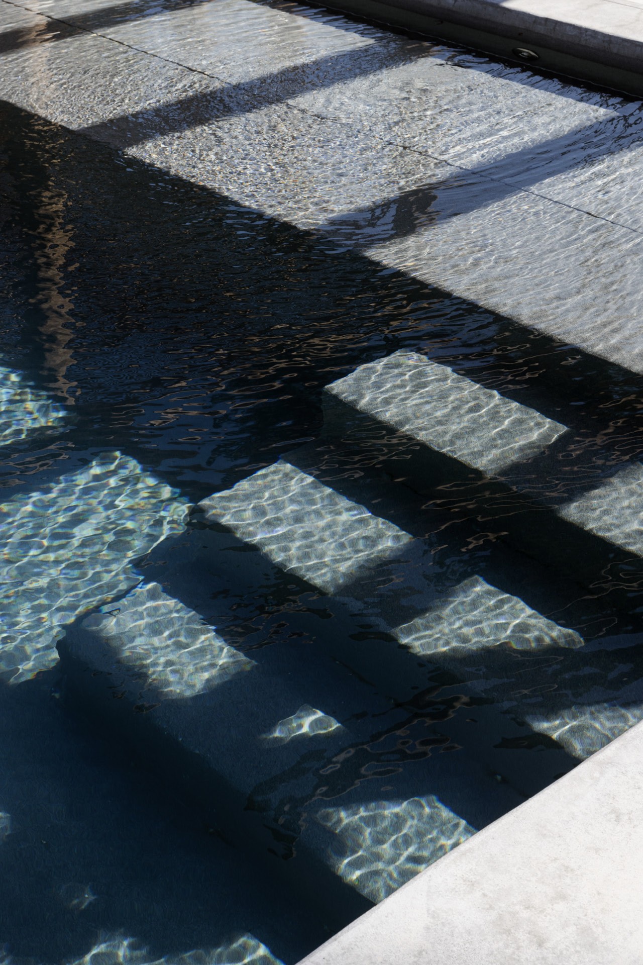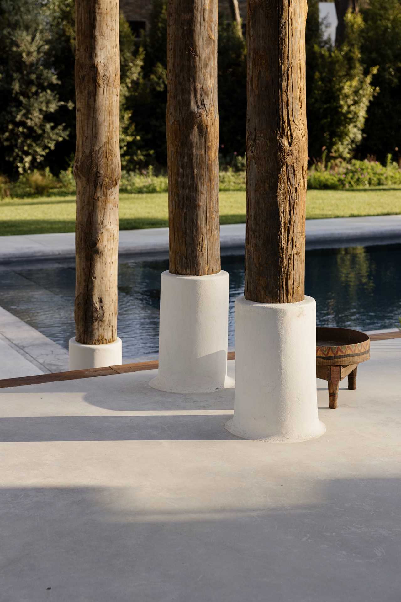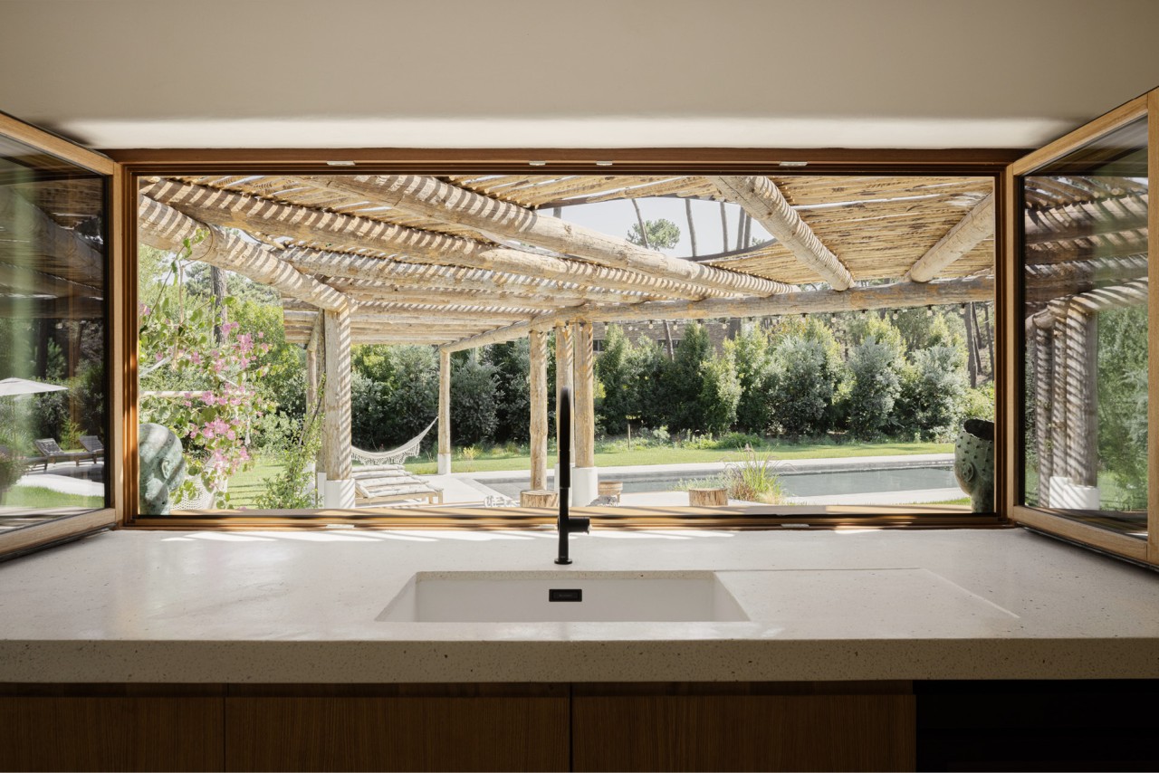 Réalisée en pin brut issu de la scierie locale, la pergola qui prolonge la maison au-delà de ses murs participe à l’unification de la construction principale, de la piscine et du paysage. Elle valorise les matériaux locaux et met en avant le savoir-faire artisanal, illustrant une architecture profondément ancrée dans son territoire. Utilisant du bois massif, de la chaux et quelques touches de grès cérame, la maison met à l’honneur des matériaux naturels, bruts et locaux, en harmonie avec le contexte. Elle promeut une architecture frugale, où la sobriété des matériaux et leur mise en œuvre devient une forme de luxe.