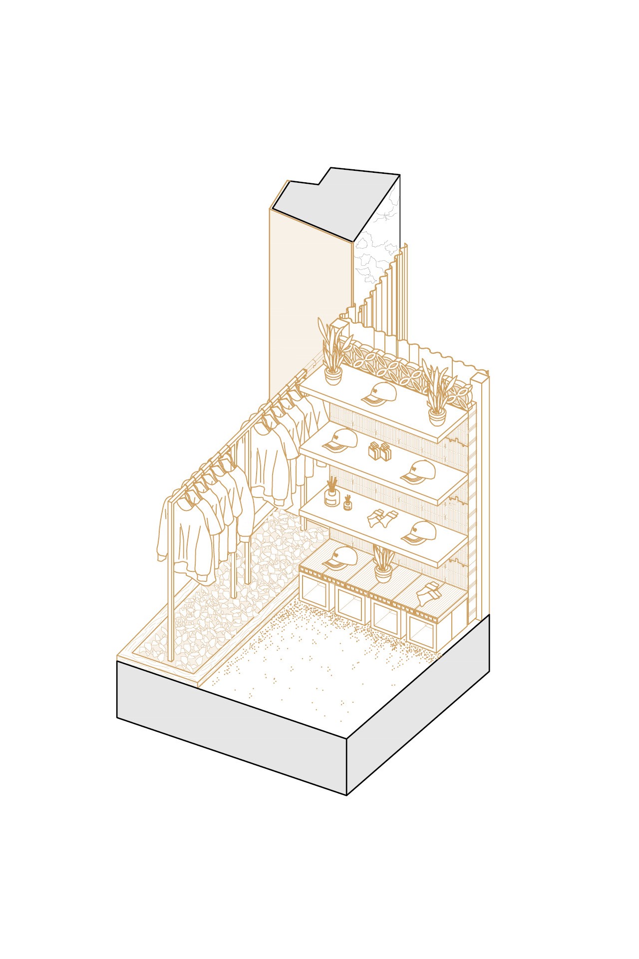 Imprégné de l’identité franco-caribéenne de la marque, le projet transpose les éléments emblématiques de la Trinité-et-Tobago en plein cœur du Marais, transformant le fil à linge en présentoir à croquis, la brique creuse en dentelle, l’éclat du soleil en miroir.