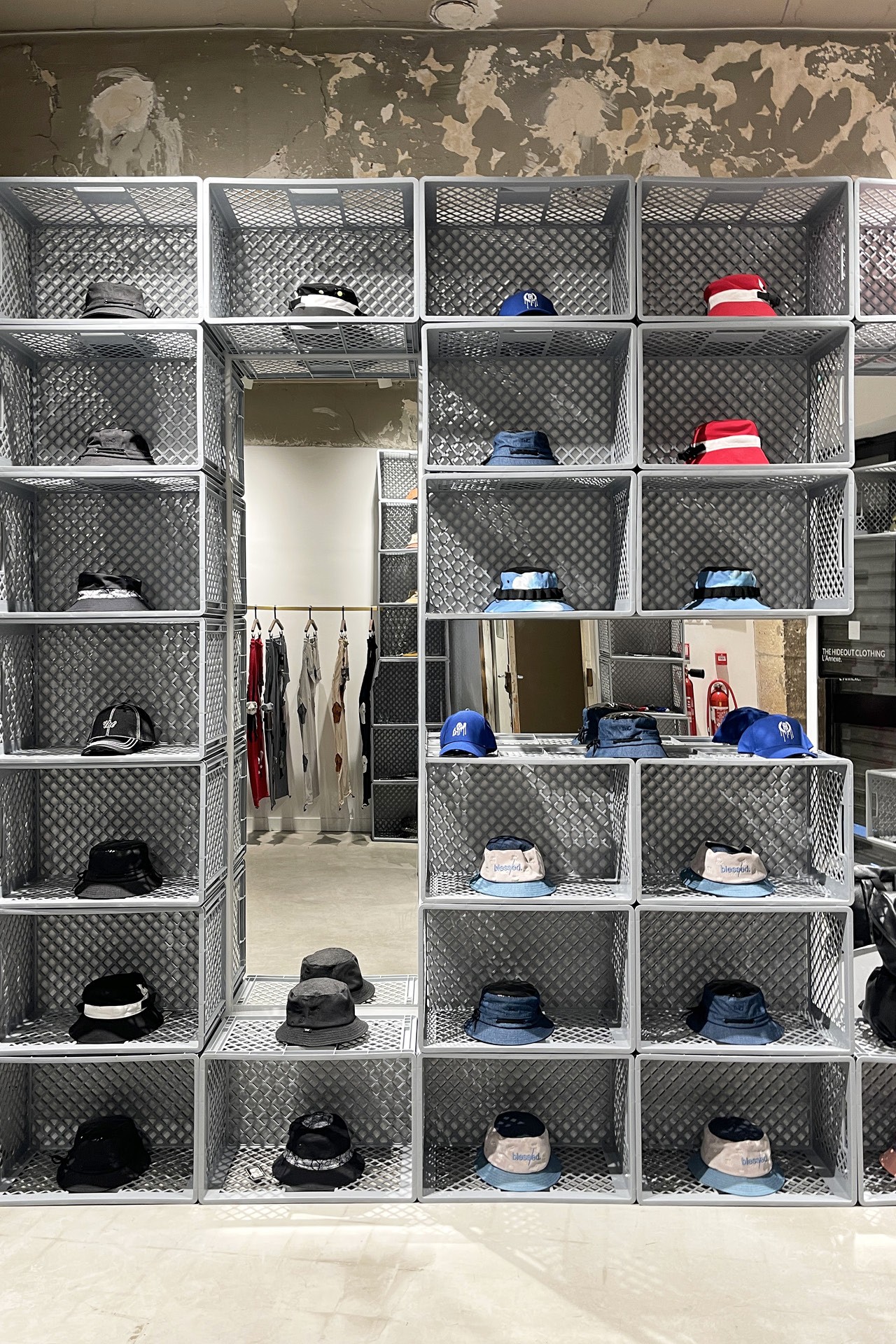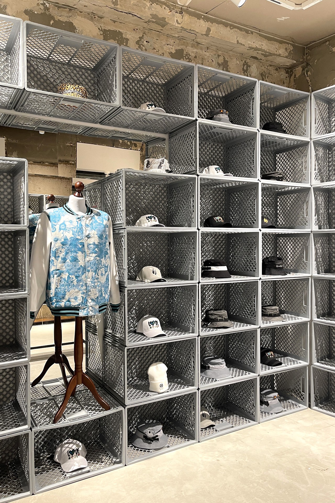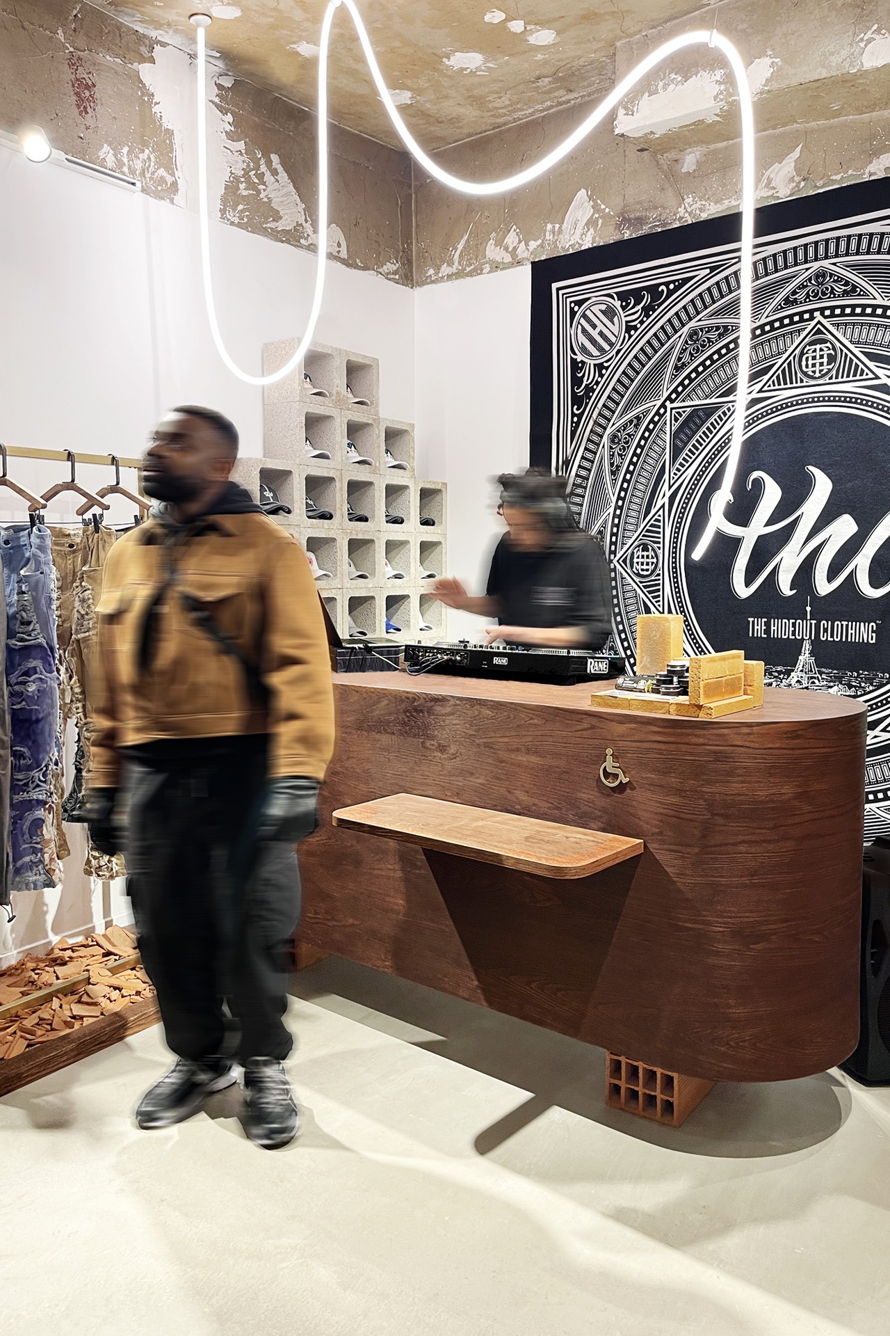 Fusion de l’univers du Street wear et de la Haute Couture, le flagship store offre une expérience immersive où la rudesse de la « street » rencontre le raffinement de la capitale de la mode par la confrontation de matériaux de récupération, bruts et grossiers, et de portants sophistiqués.