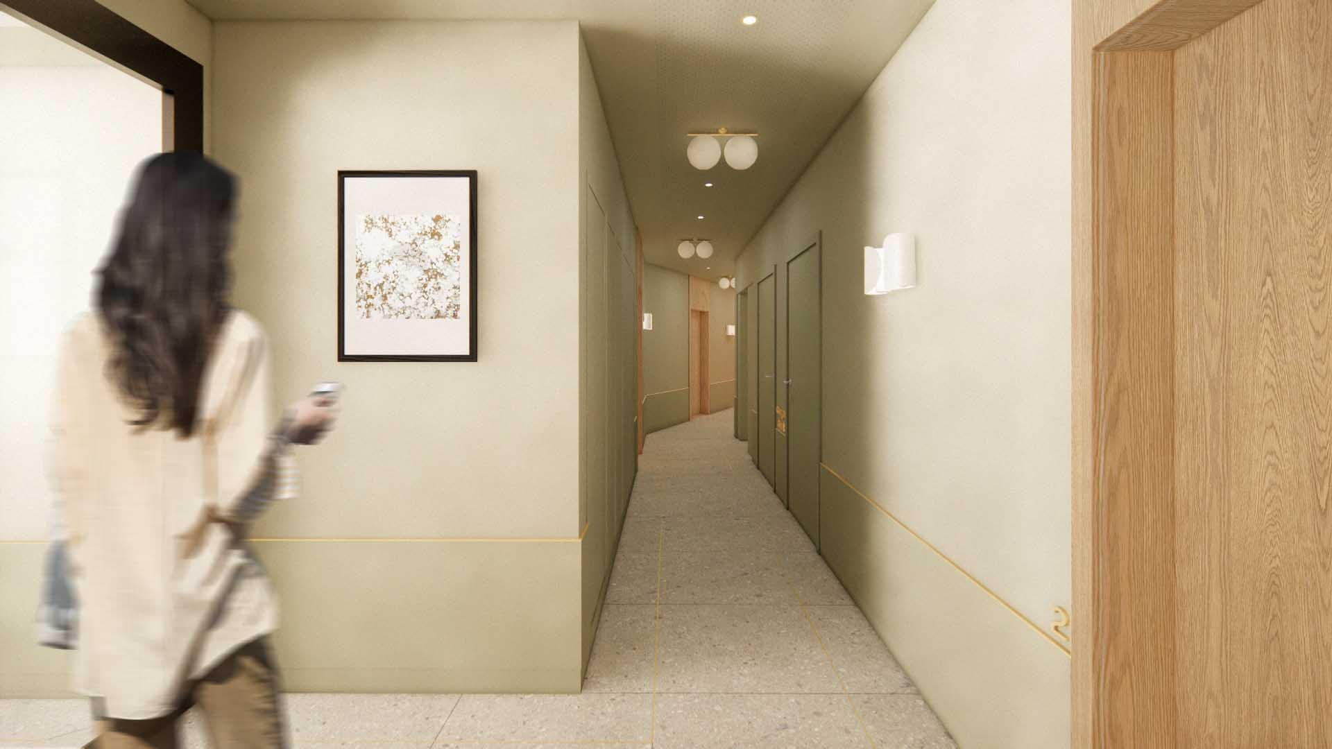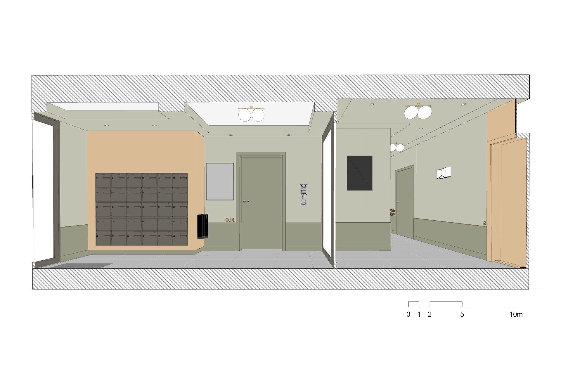 Le projet d’aménagement des parties communes intérieures s’inscrit dans un programme plus large de construction d’un immeuble d’habitations collectives de 30 logements en VEFA, auquel il donne une âme et une identité par la matérialité et les ambiances qu’il y développe.