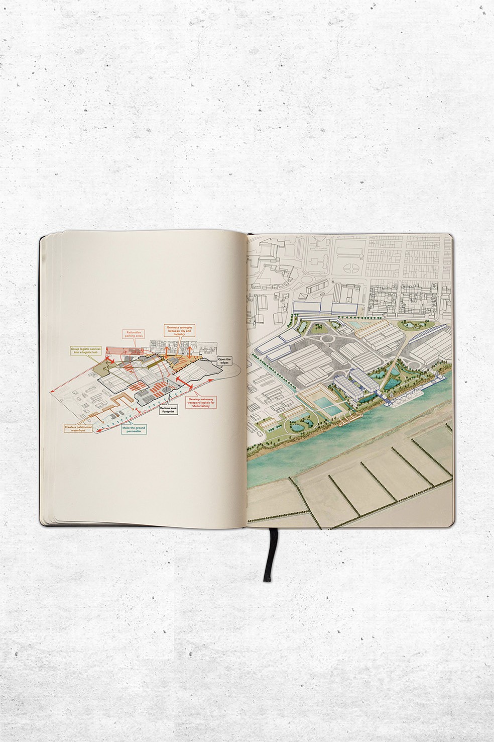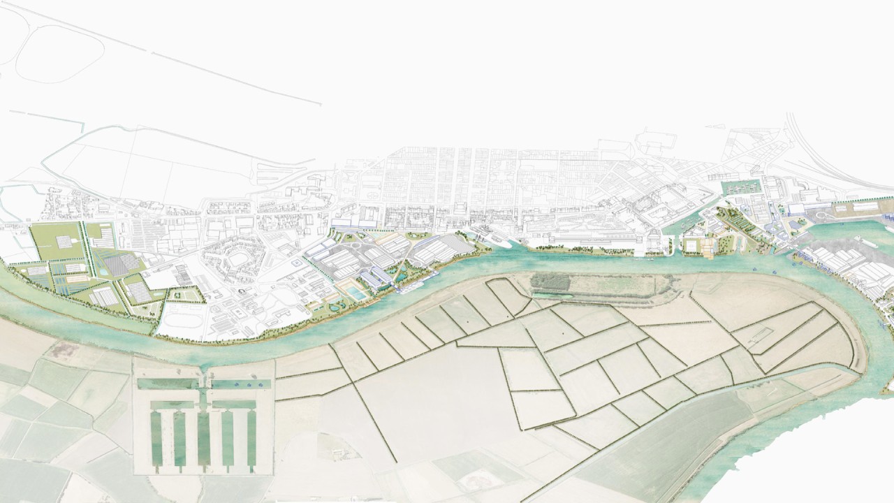 Face au risque de la montée des eaux, la stratégie consiste à faire coexister la ville et le fleuve afin de prendre en compte leurs besoins respectifs d’expansion et de garantir le maintien des activités tout en respectant l’environnement. Il s’agit d’augmenter la perméabilité du territoire et d’améliorer ainsi sa résilience via la libération des sols et l’introduction en ville de zones tampons végétales qui gèrent les flux hydriques. Un dispositif végétal hydrophile aide à protéger naturellement le territoire, transformant ainsi la protection technique contre la montée des eaux en un espace public paysager support de fonctions spatiales, sociales, productives et écologiques capables de faire le lien entre les différents secteurs de Rochefort.